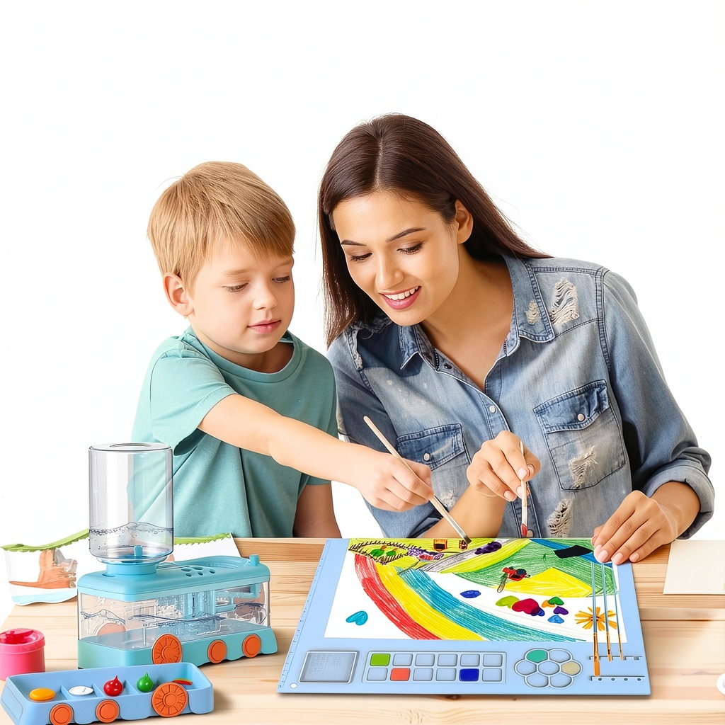 This all-in-one paint brush cleaning set features a magical water circulation system that recycles dirty water instantly, keeping young artists’ workspace tidy. It comes with a colorful PVC smock and large waterproof mat to protect clothes and surfaces from messy paint. Perfect for children ages 5-12, it encourages creativity and responsibility with safe, BPA-free materials.