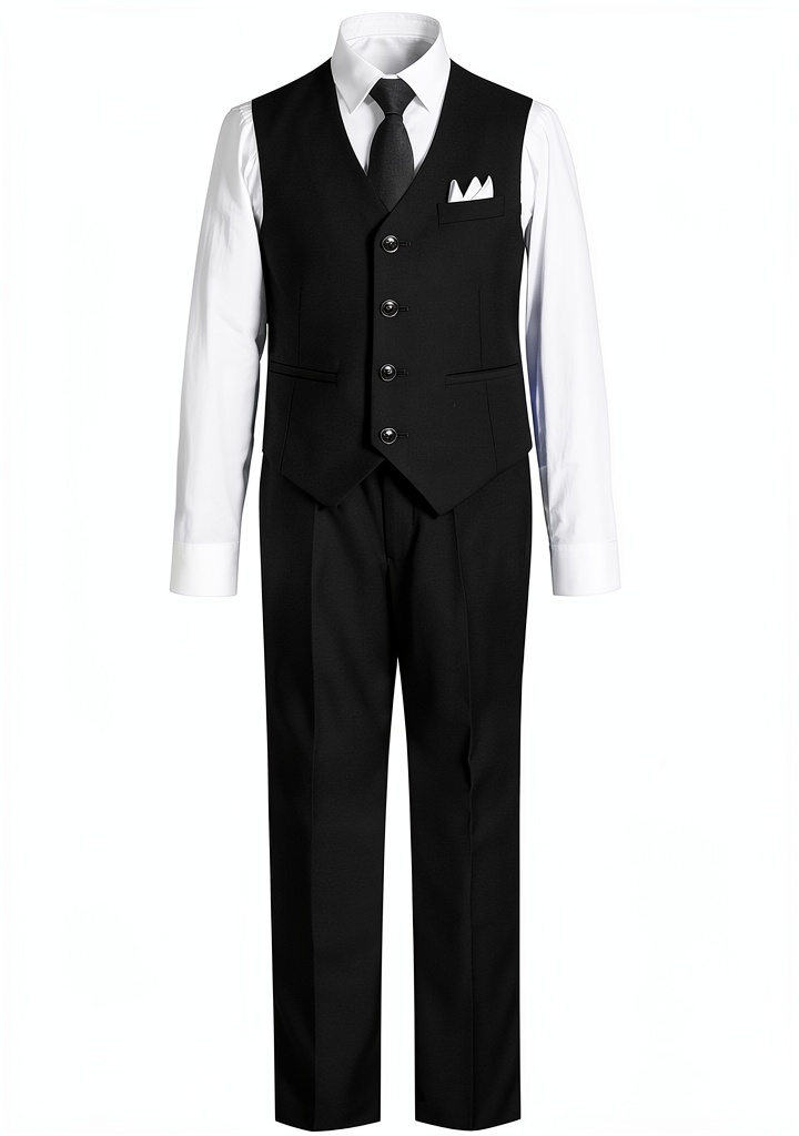 - Complete 4-piece set with vest, pants, shirt, and accessories for a full formal look